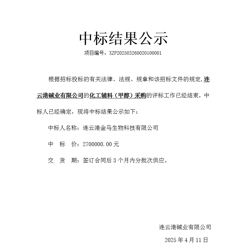 化工輔料(甲醇)采購中標(biāo)結(jié)果公示