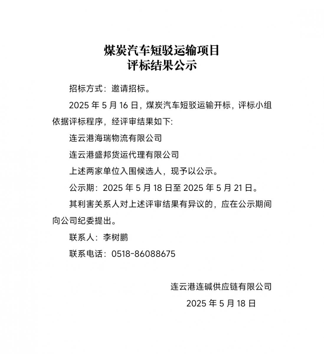 連云港連堿供應(yīng)鏈有限公司煤炭汽車短駁運輸項目評標(biāo)結(jié)果公示