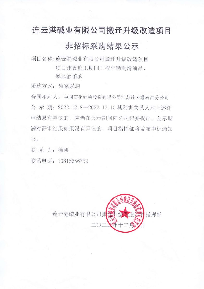 項目建設施工期間工程車輛潤滑油品、燃料油采購非招標采購結(jié)果公示