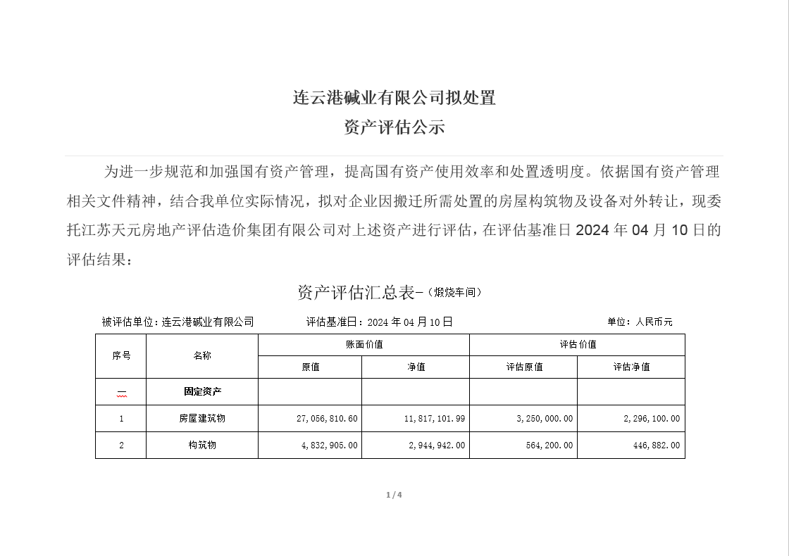 連云港堿業(yè)有限公司煅燒、熱電、重堿車間資產(chǎn)評估公示