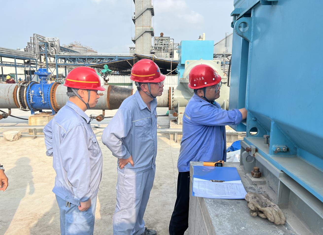 上午11:28,伴隨著“具備條件,啟動(dòng)電機(jī)”指令的發(fā)出,操作人員按下空分循環(huán)水泵P820101A“啟動(dòng)”開關(guān),電機(jī)開始高速旋轉(zhuǎn),隨后操作人員依次開啟P820101B、C??辗盅h(huán)水泵單機(jī)試車的現(xiàn)場(chǎng)“熱辣滾燙”,大家衣衫被汗水濕透,但熱情依舊高漲。操作人員每隔15分鐘就詳細(xì)檢查記錄電機(jī)的軸溫、轉(zhuǎn)速、振值等指標(biāo)。