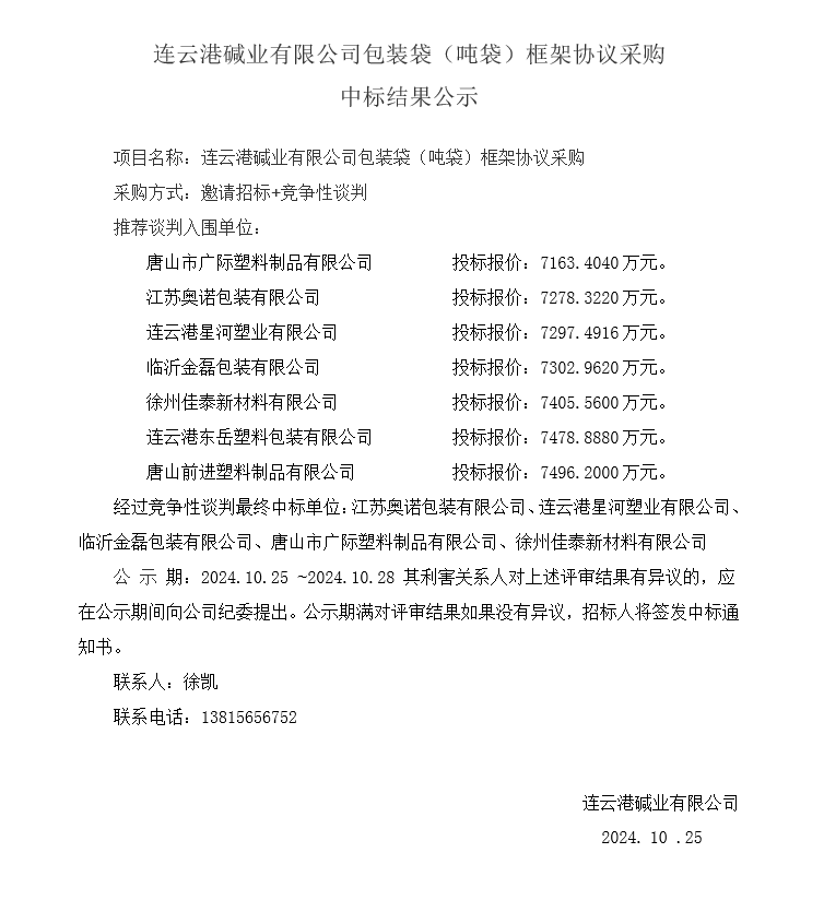 連云港堿業(yè)有限公司包裝袋(噸袋)框架協(xié)議采購(gòu)中標(biāo)結(jié)果公示