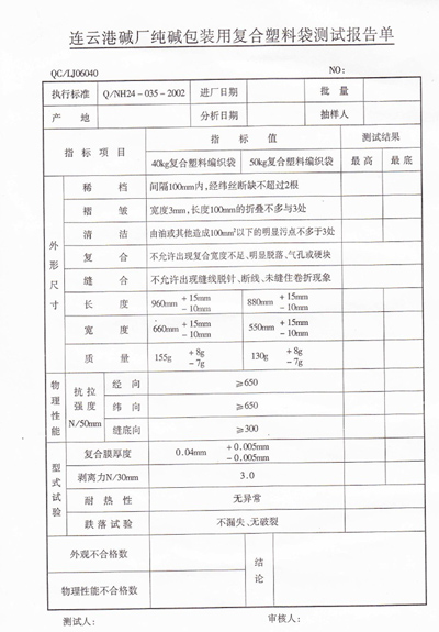 5.6 其他主要資格要求:具有合法有效的生產(chǎn)許可資質(zhì),企業(yè)制度完善、質(zhì)量管理規(guī)范,具有完整的拉絲、織布、縫紉、檢測等生產(chǎn)線,注冊資金不少于500萬元(人民幣)。食品包裝袋投標(biāo)人應(yīng)具備食用包裝物生產(chǎn)許可資質(zhì),并提供第三方檢測報(bào)告。投標(biāo)人必須送樣品袋先經(jīng)我公司質(zhì)檢部門檢測合格(2018年10月20日之前送到連云港堿業(yè)有限公司供應(yīng)部,原招標(biāo)人供應(yīng)商不需送樣品袋)。符合法律、法規(guī)規(guī)定的其他條件。